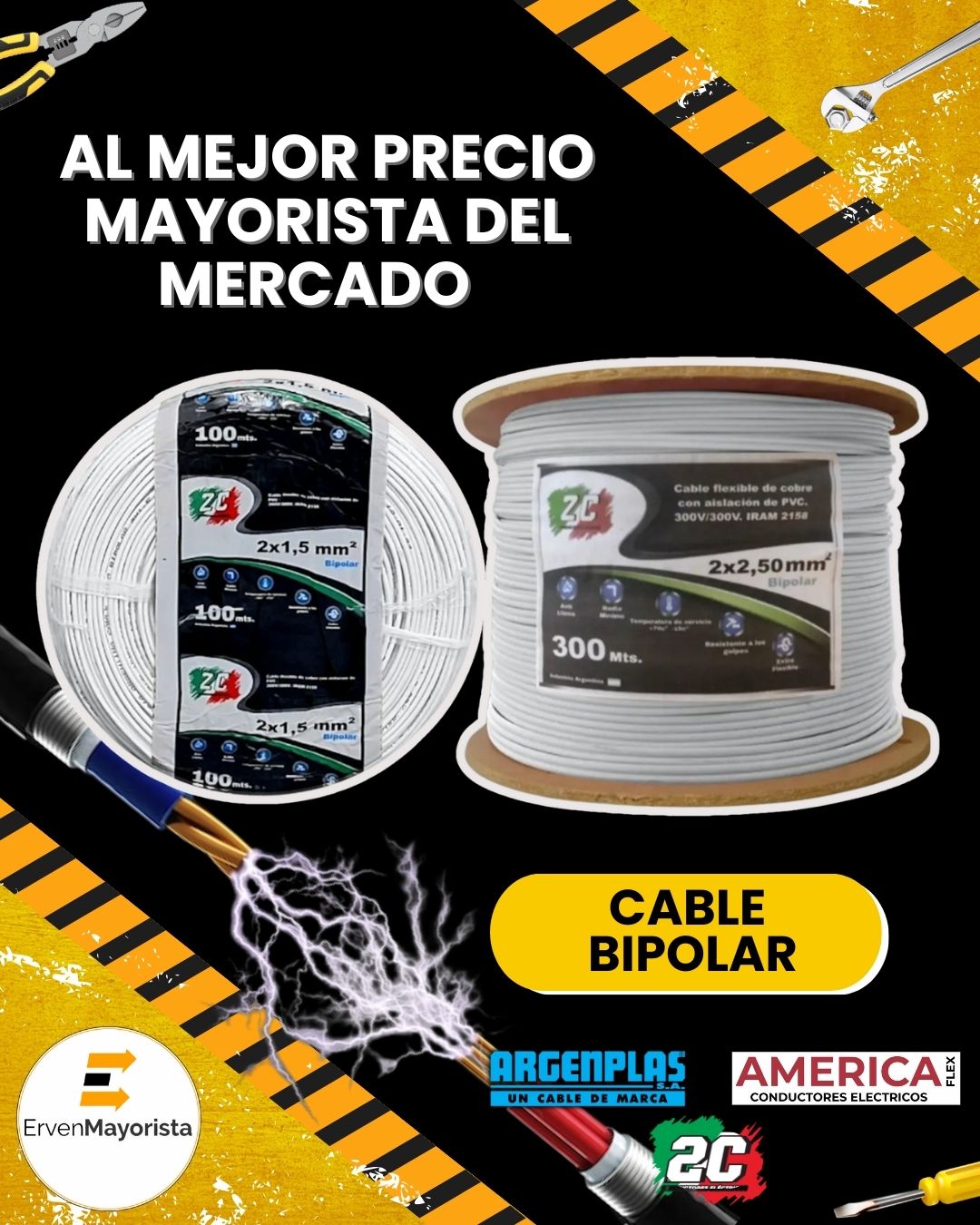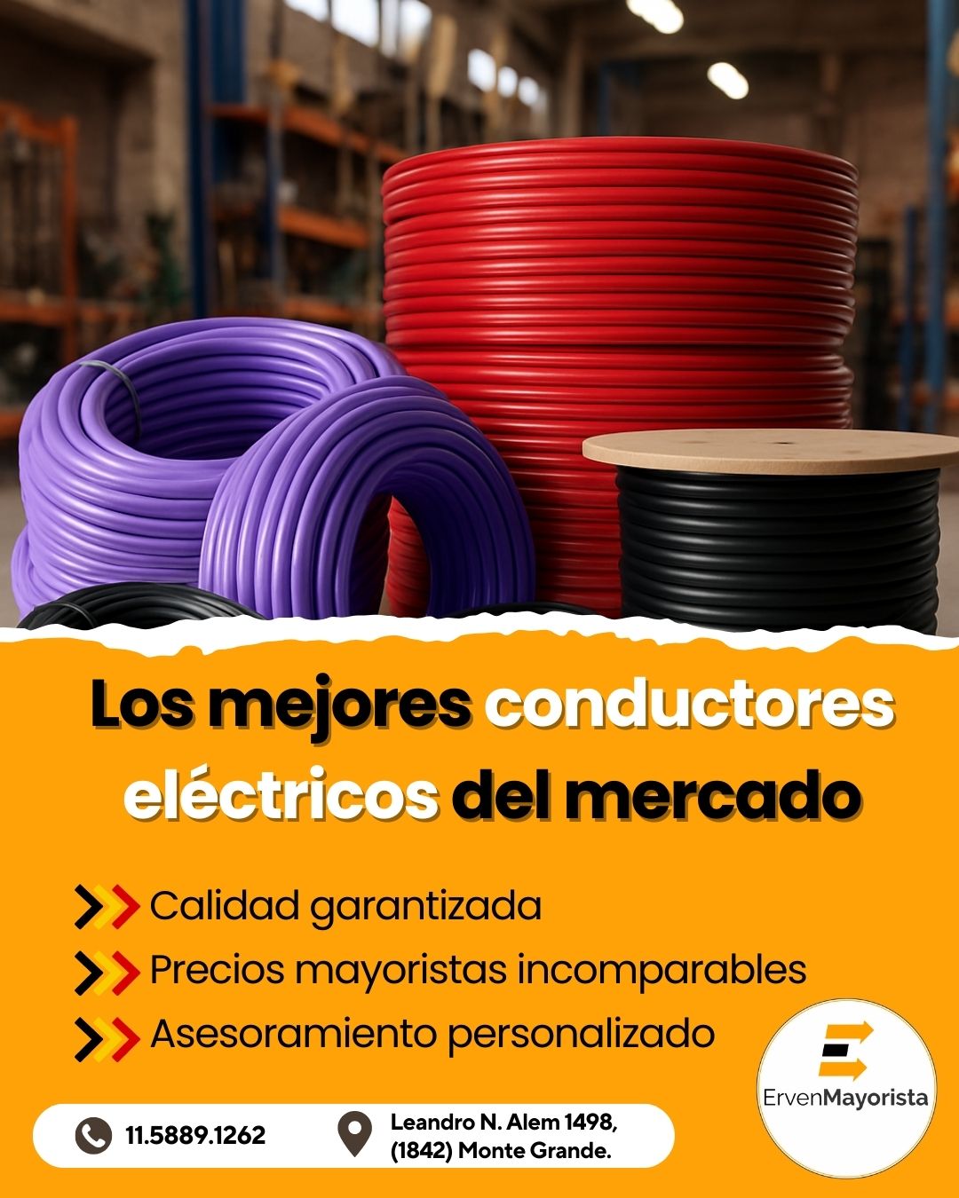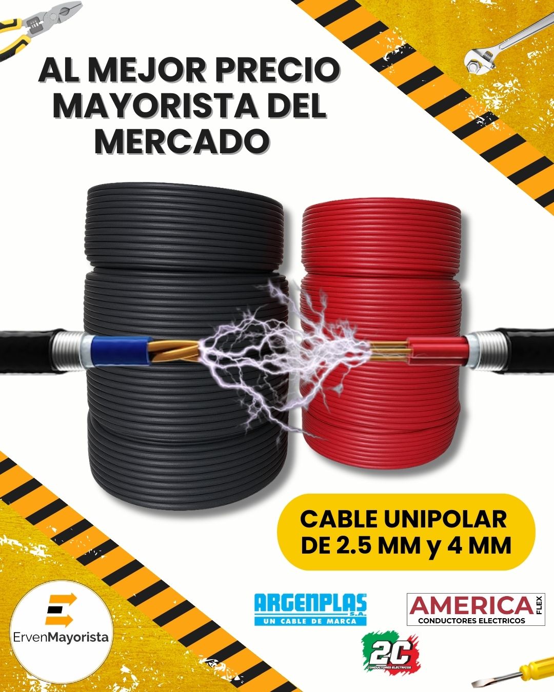 Los mejores conductores eléctricos del mercado al mejor precio mayorista. Trabajamos con las marcas: Argenplas, 2c y América Flex. Calidad garantizada, precios mayoristas incomparables, asesoramiento personalizado. Descubre nuestros cables conductores. Ideales para instalaciones eléctricas fijas, electrodomésticos y/o aislación. Cable unipolar (de 2.5 mm y 4mm: aislación de pvc, resistente a altas temperaturas y humedad). Cable bipolar: para iluminación y pequeños. Cable tipo taller: para instalaciones eléctricas móviles y portátiles – alta flexibilidad y resistencia. Cable sintenax: apto para instalaciones subterráneas – seguridad ante la propagación de incendios. En Erven Mayorista elegí el cable perfecto para tus proyectos. ¡Sin duda tenemos los mejores precios al por mayor! ¡Bombas y motores al Mejor precio! Trabajamos directo con: Motorarg – Pedrollo (made in Italy) – Vasser – Leo. Erven Mayorista.